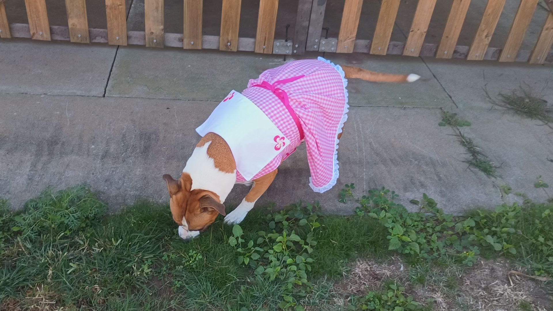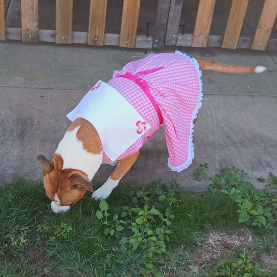 Gingham print farm style dress, with square collar featuring 2 butterflies each corner, gathered skirt trimmed with white frill, and finished with a pink waist ribbon and bow.